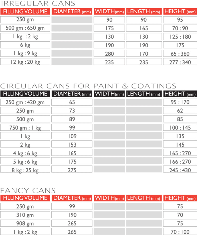 A diversification of packaging solutions are offered to deliver to different types of products for the food and beverage industry (such as confectionery, ghee and butter, household industry (detergent powder) and chemical industries (conical pails for paint), as well as promotional items for consumer products.